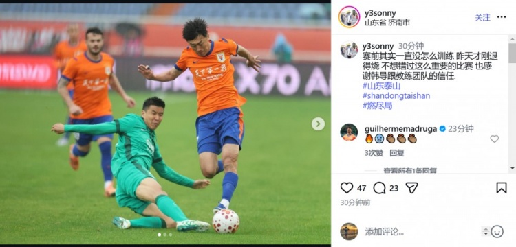 3月14日讯 泰山本轮主场战胜国安,刘洋赛后更新社媒庆祝胜利。